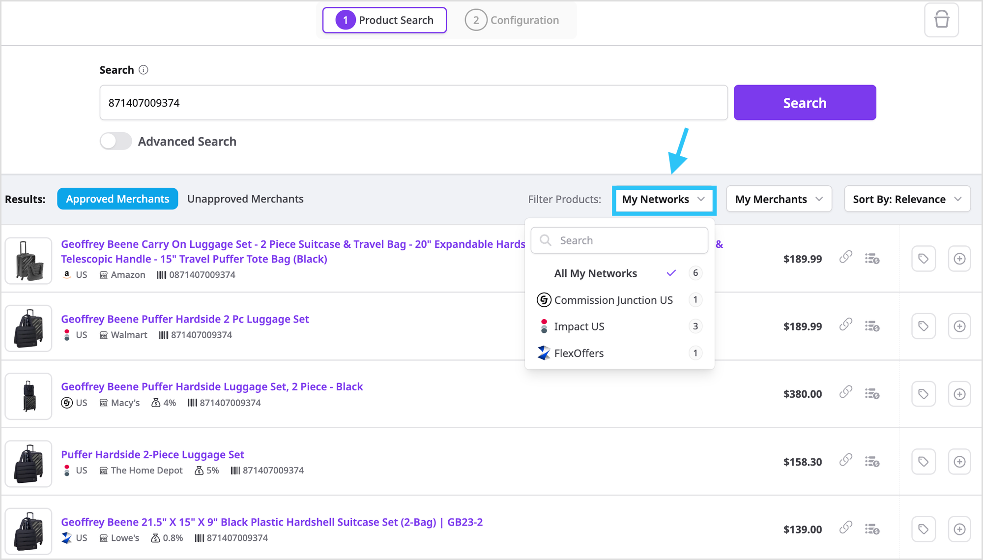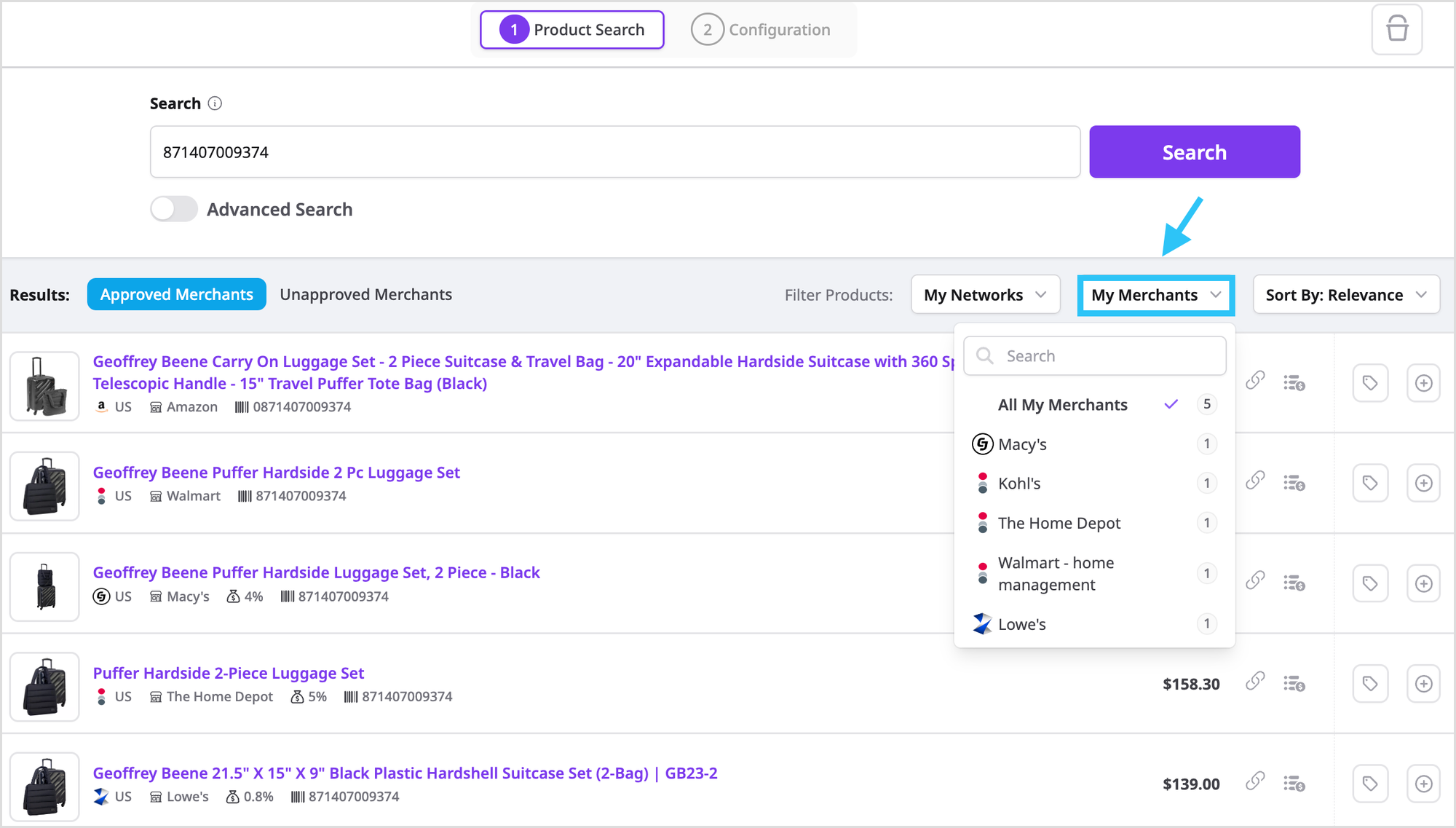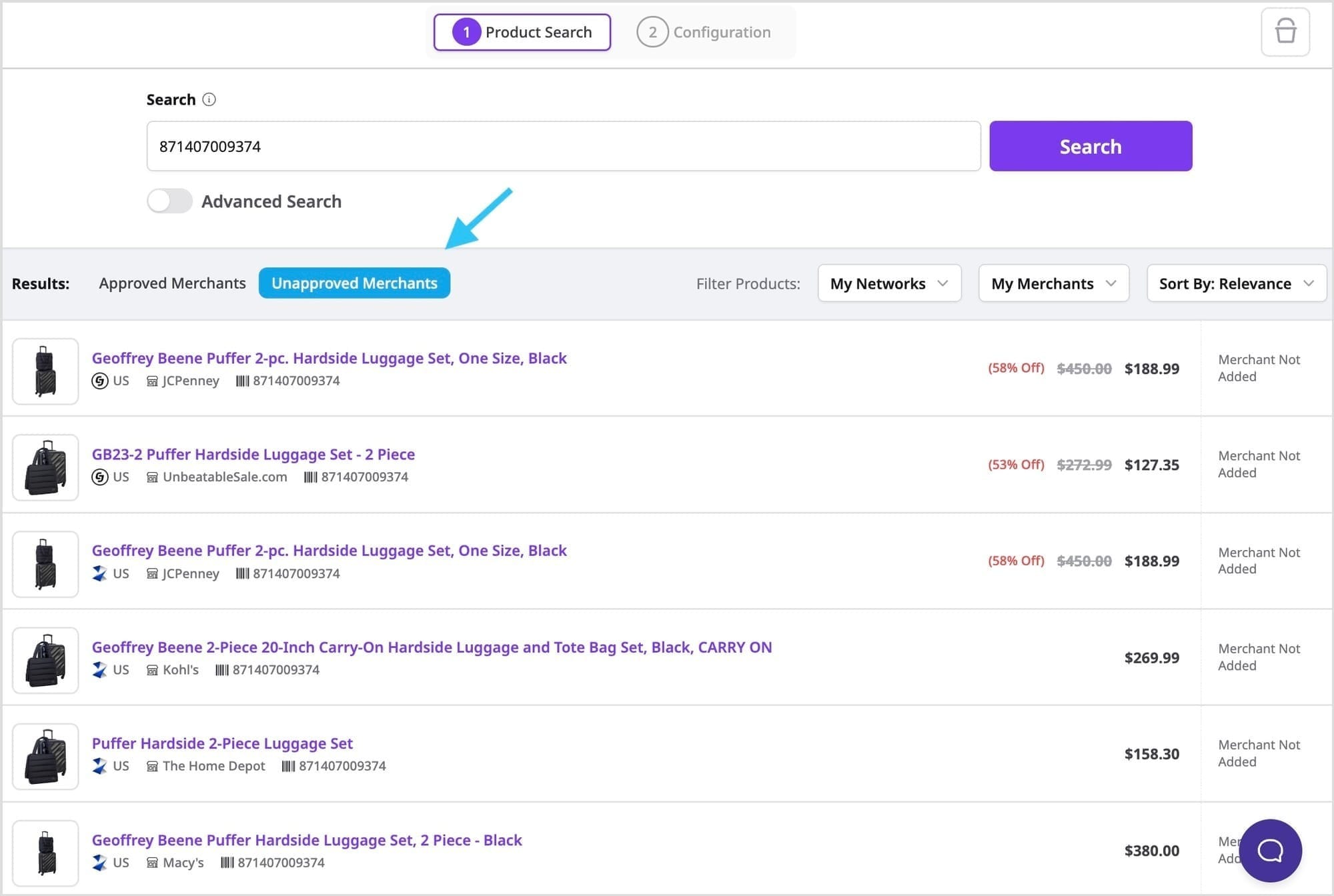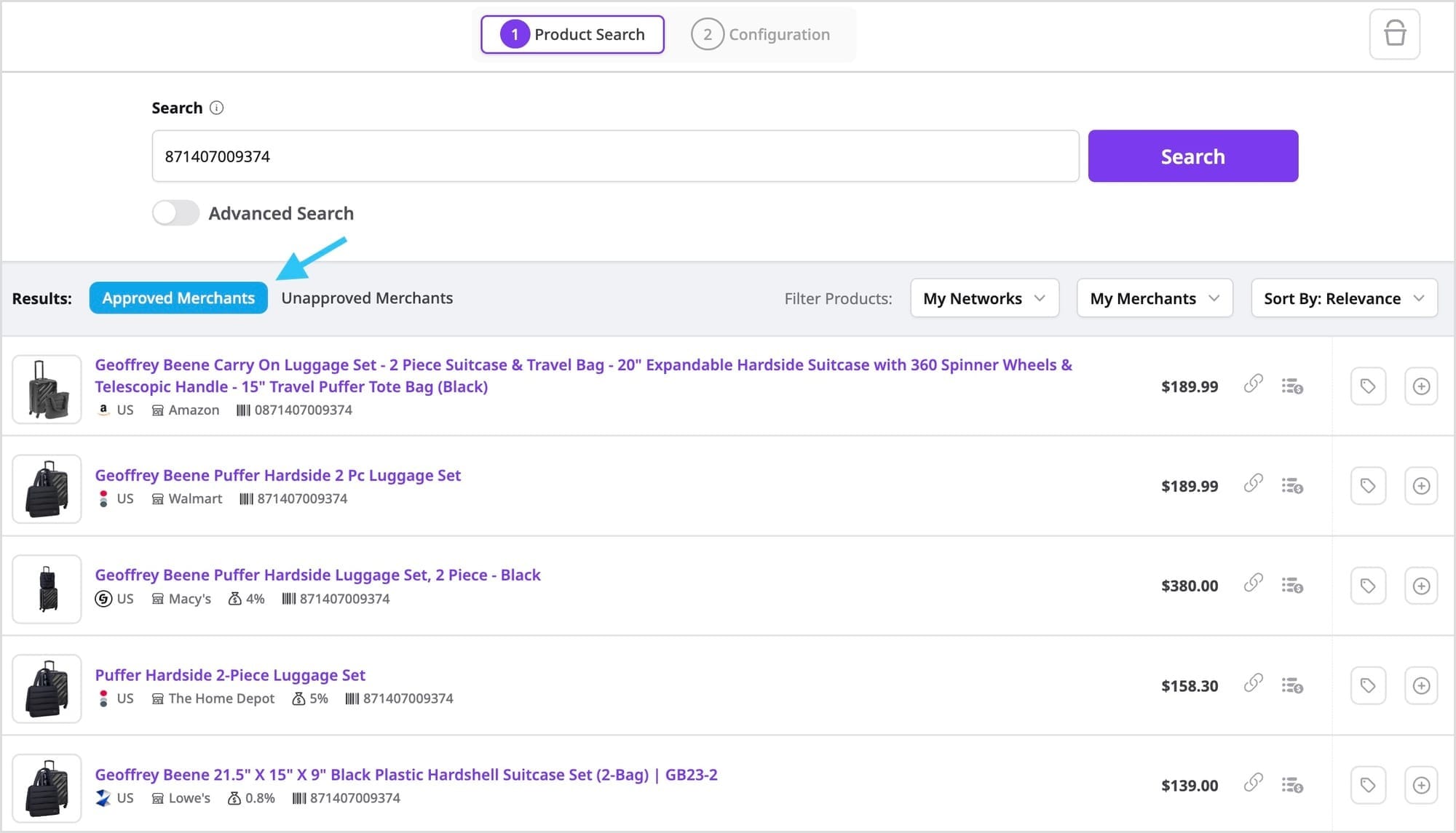 When searching for products, the search results will show offers from your approved merchants. These are merchants that you have approval to work with and have added to your account.