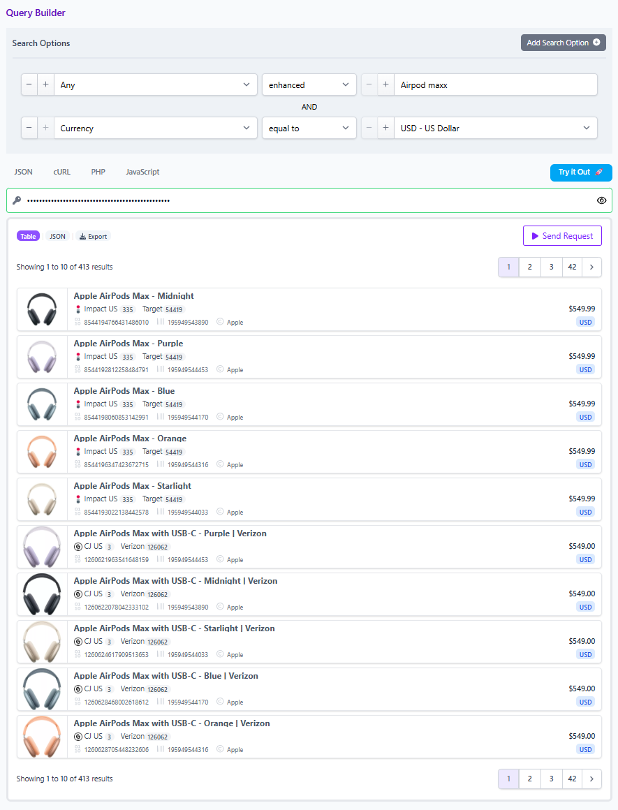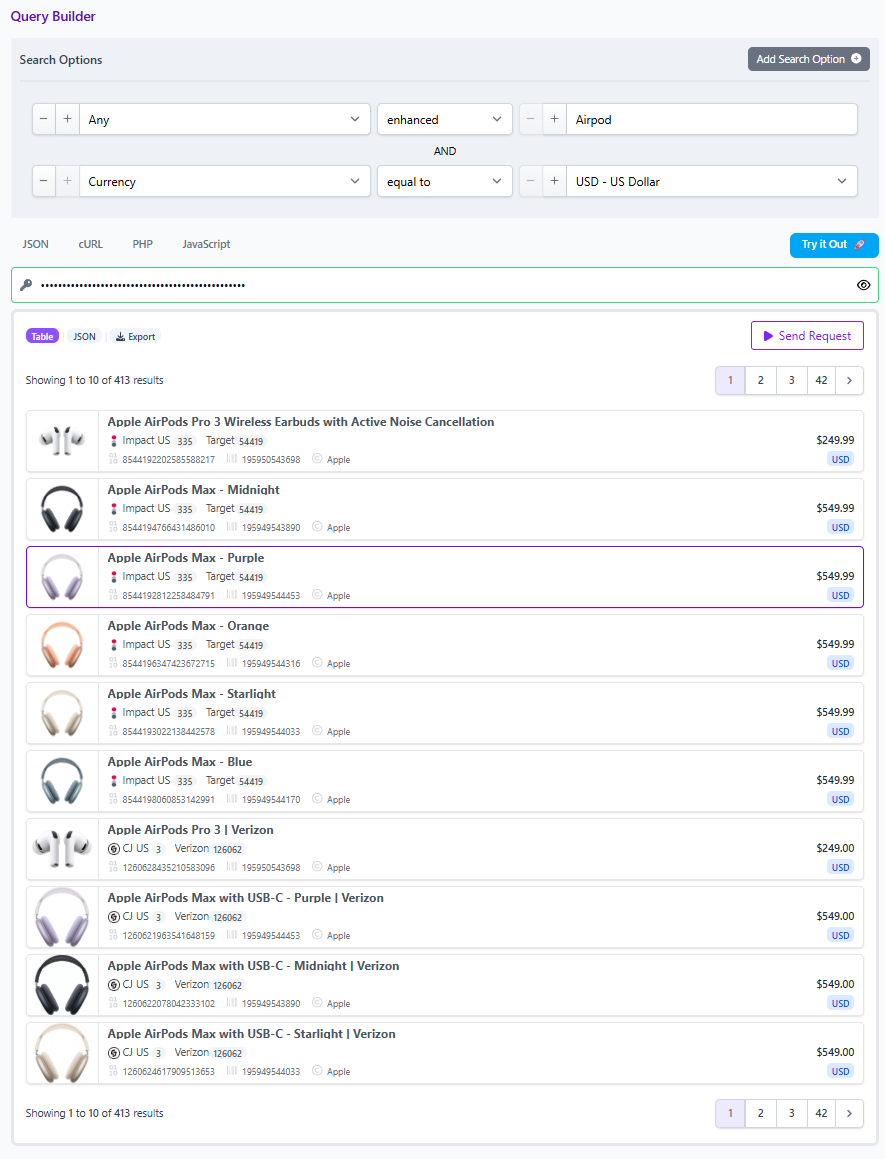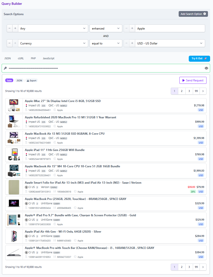 Open the Query Builder. Choose Any, then in the operator menu select enhanced. Add Currency equal USD and optionally Brand equal Apple. Click Try it Out, review the ranked set, then export JSON or save the Comparison Set for your team.