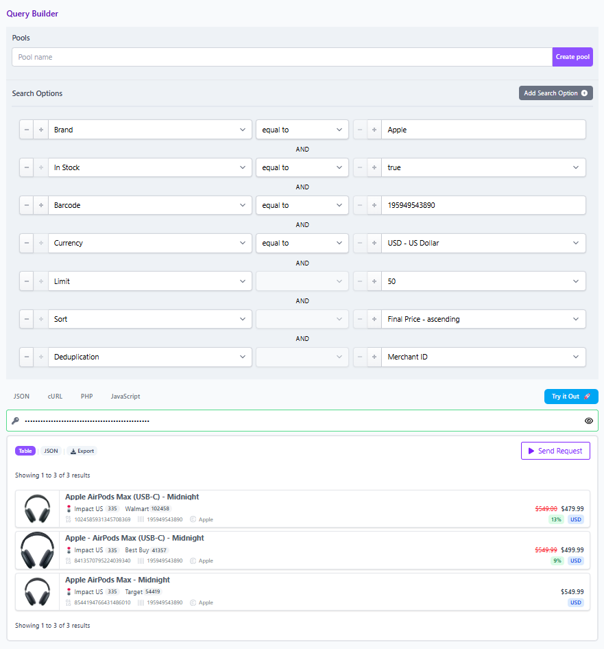 Run one. Match by Barcode to pull the exact SKU from all participating merchants and networks. Keep Deduplication off to see every offer. Sort by Final Price to reveal the best offer at time of writing. Add On Sale true to focus on active discounts.