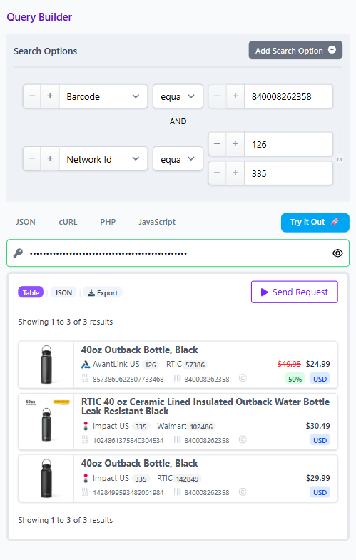 Scenario: you are updating a roundup and want the exact same water bottle across multiple merchants, then pick the best in stock offer.