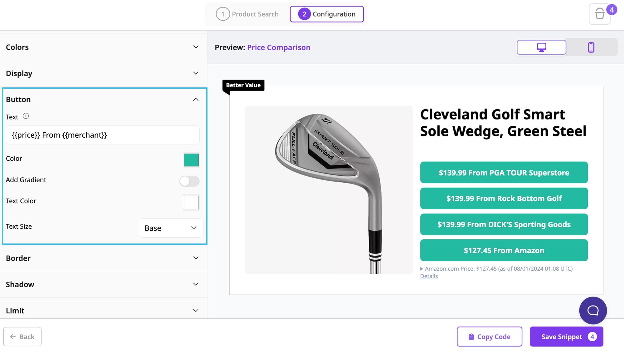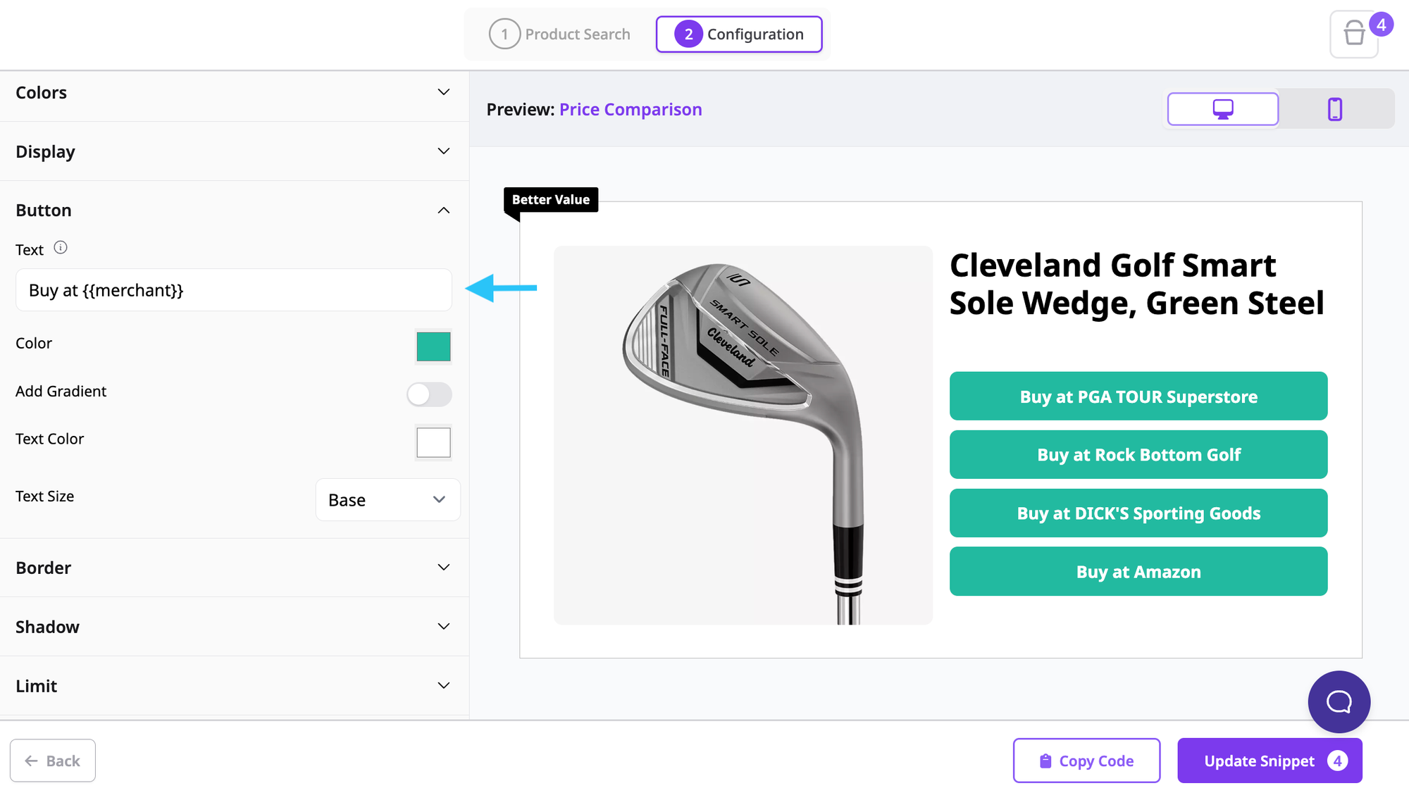 Enter custom text or use variables such as price and merchant, which will be automatically populated with the relevant information. For example: "{{price}} from {{merchant}}," "Buy at {{merchant}}," etc. would translate to "$139.99 from PGA Tour Superstore" or "Buy at PGA Tour Superstore."