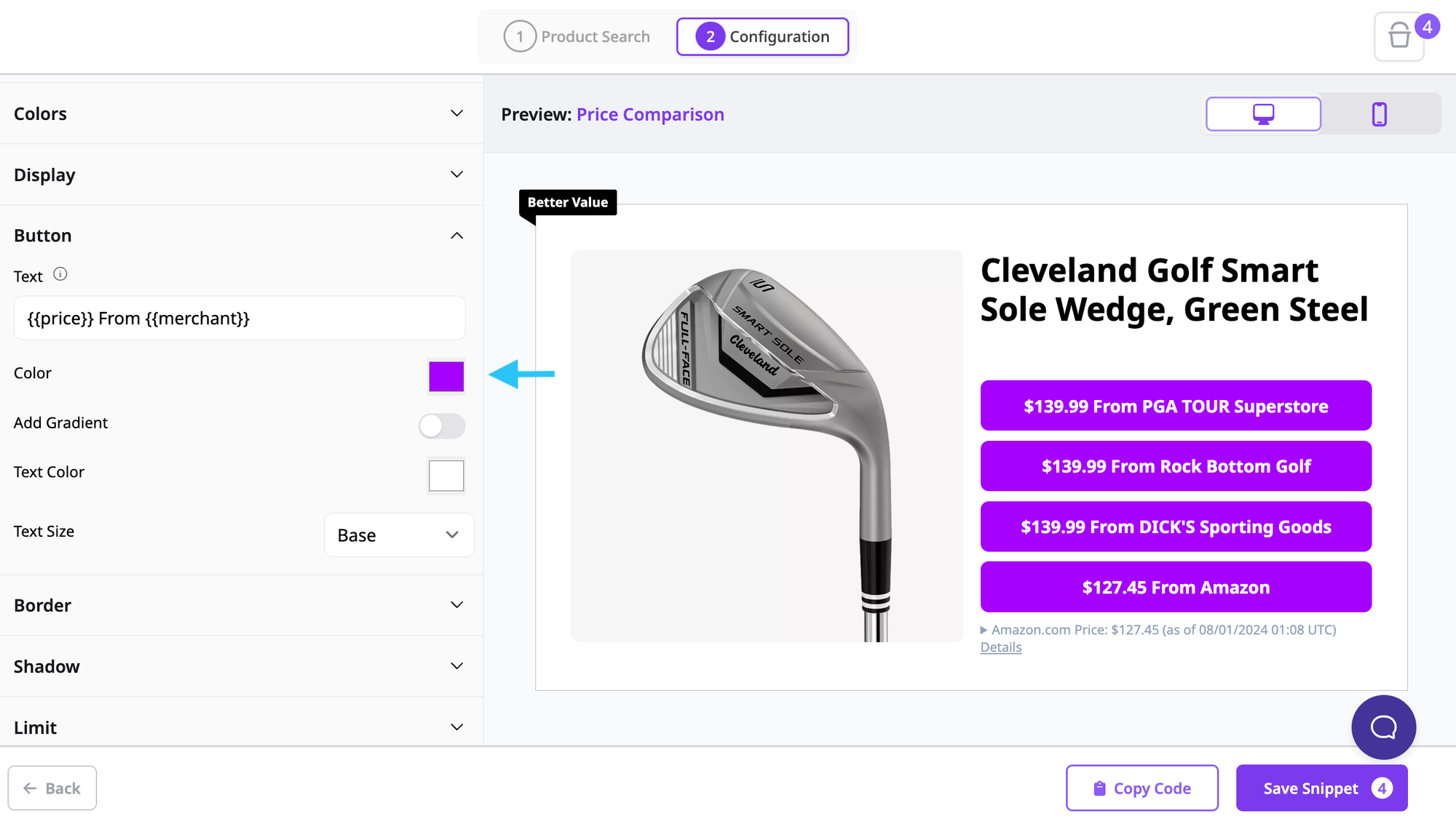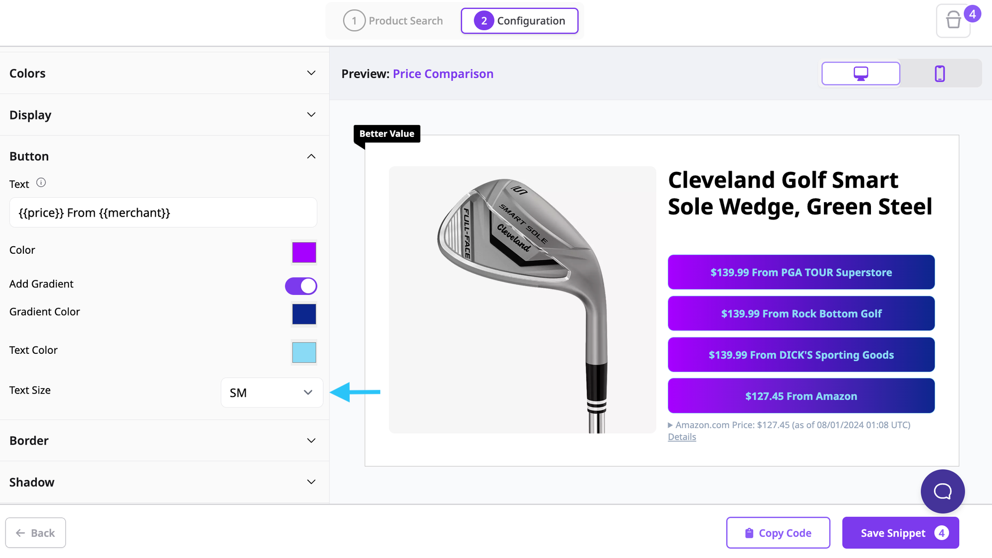 The Button section includes all the elements needed to configure the Buy Buttons in your Snippets. This includes customizing the text, color, size and more.