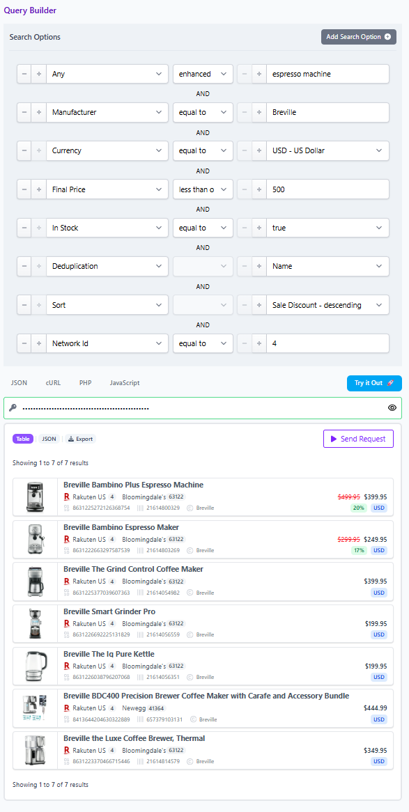 Start broad with the any field for “espresso machine.” Then layer brand filters for a controlled manufacturer set. Add currency to keep the page regionally coherent. Add final price above a premium threshold. Filter to in stock products only. Then switch deduplication on to review product variety, and off to inspect merchant level offer spread for the final shortlist.