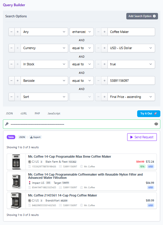 "search":[{"field":"any","value":"Coffee Maker","operator":"enhanced"},{"field":"currency","value":"USD","operator":"="},{"field":"in_stock","value":true,"operator":"="},{"field":"barcode","value":"53891156097",