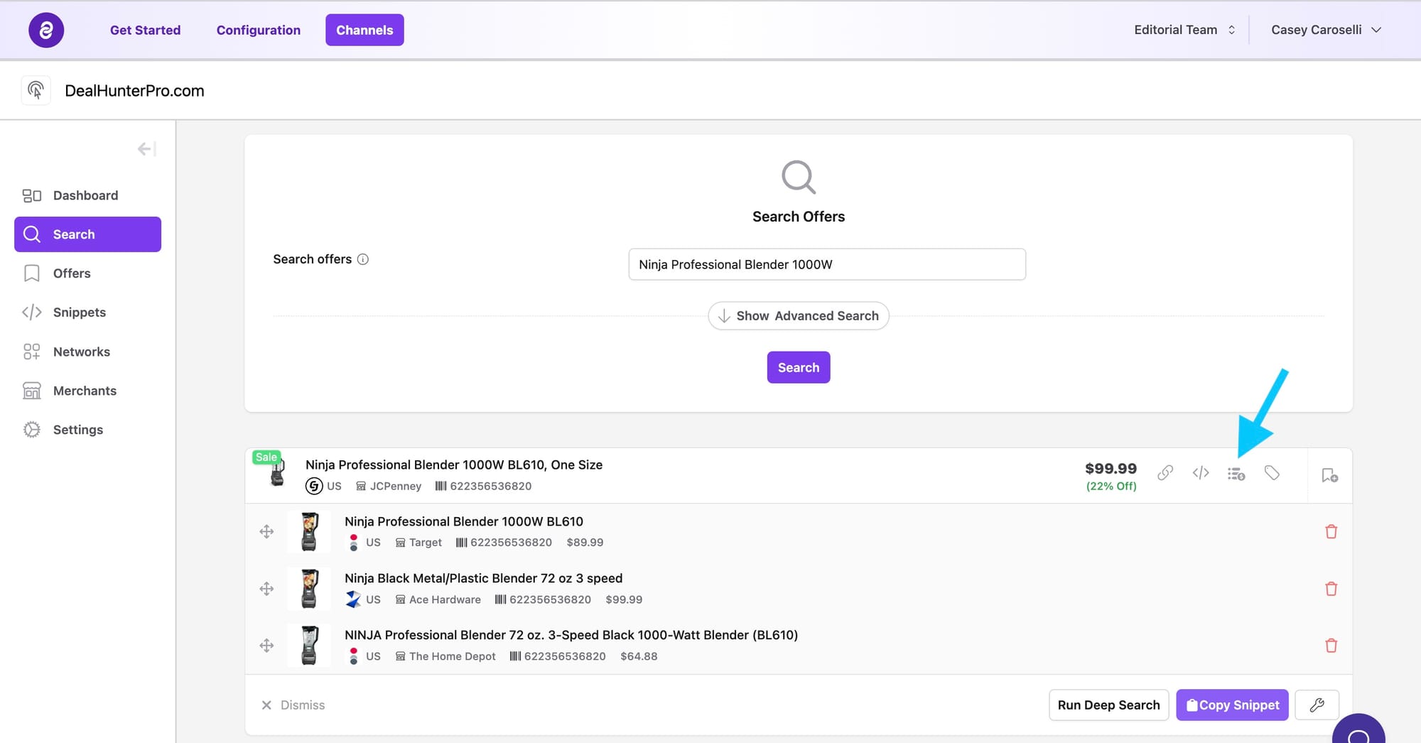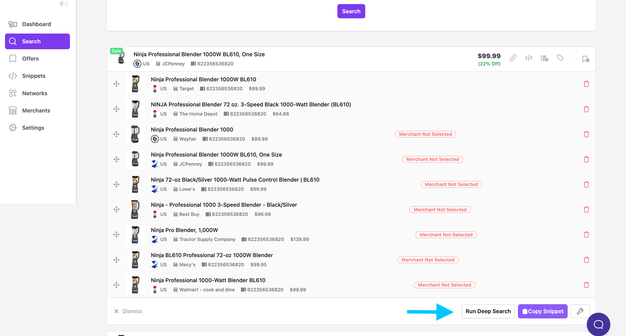Deep Search scans configured networks to find additional merchants that list the same product you are evaluating. Use it after a standard product search when you want broader coverage or when your initial results only include merchants already in your account.