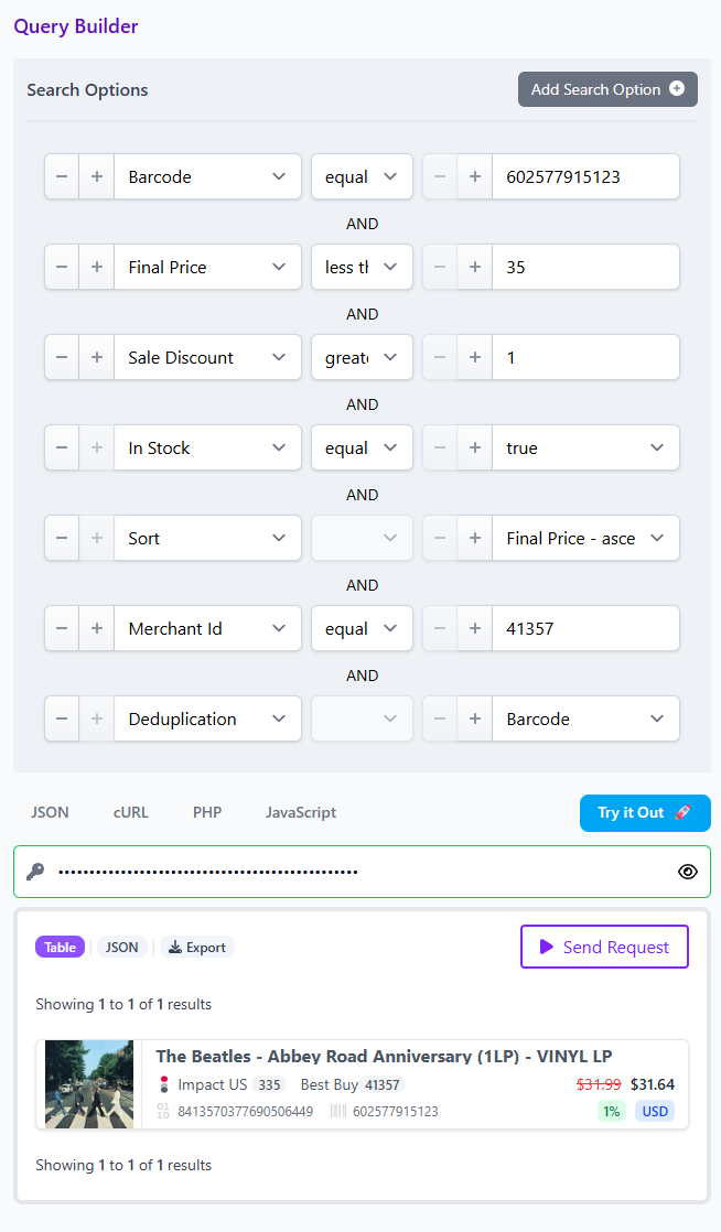 - Input a barcode or MPN to retrieve all matching listings across merchants