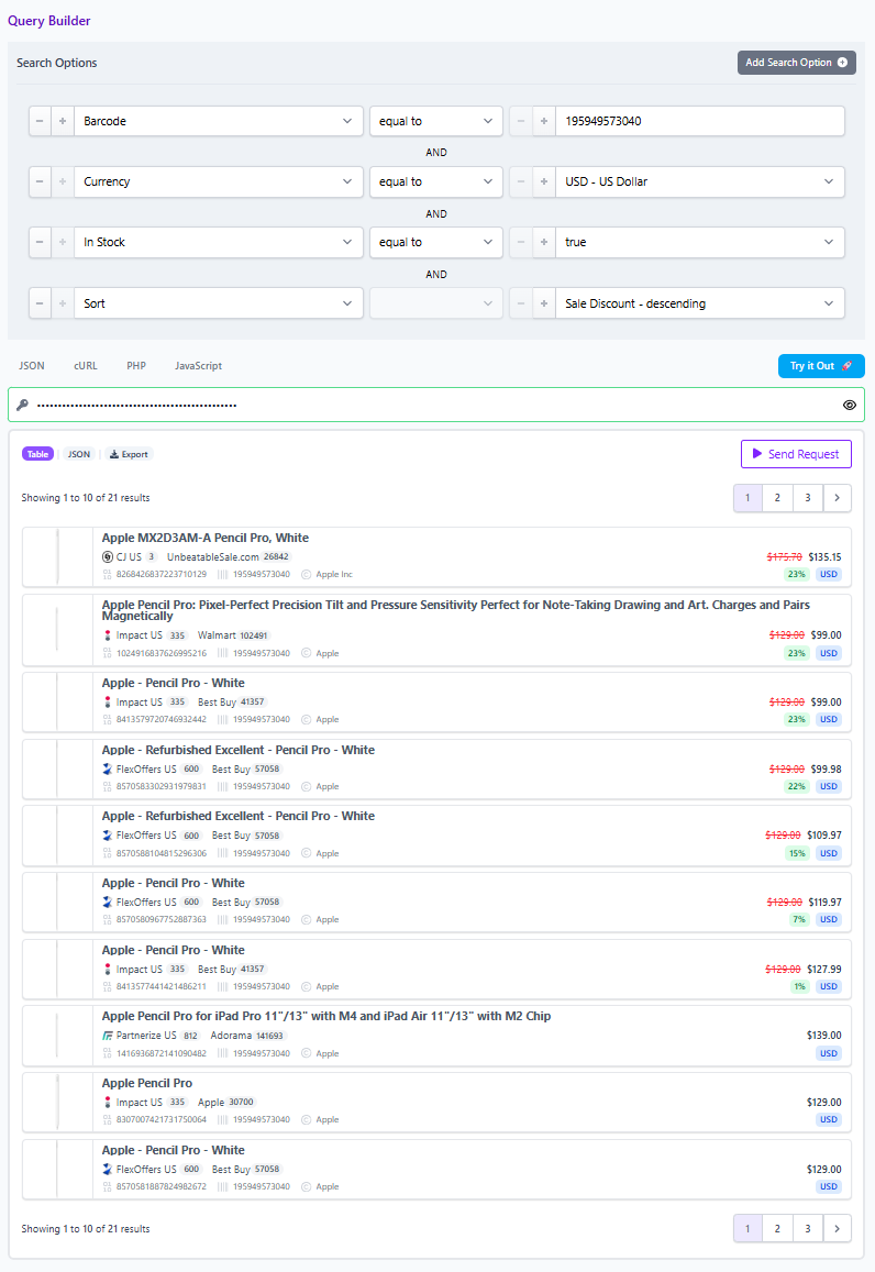 - If you have a barcode, query by barcode to pull the exact same product across multiple merchants.