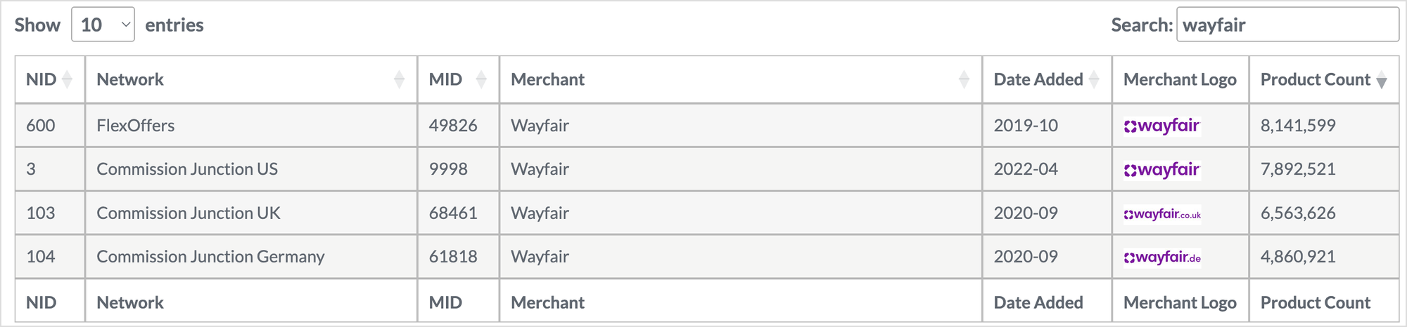 Sort by network to group all merchants under one partner. Capture MID and NID for the networks you support, then export or paste into your planning doc. Add product count as a rough proxy for assortment depth. This gives business development and content teams a shared view of where to invest next.