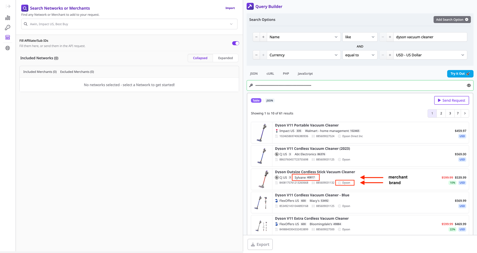 When you search for a product on Affiliate.com, the returned results include both the merchant and the brand for that product.