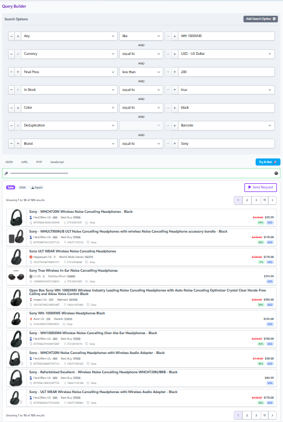 Product Data API for LLMs: Turn a natural language request into layered filters for brand, MPN, price, currency, and availability