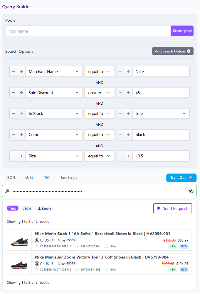 Explore these flows in the Query Builder, then lift the same parameters into your bot. Share links with your team to standardize prompts and results. When you are ready to wire this into production, use the Product Search API to replicate the exact filters, deduplication setting, and sorting you validated in the Builder. Prices and stock are at time of writing, and we recommend verifying in the live UI before you publish.