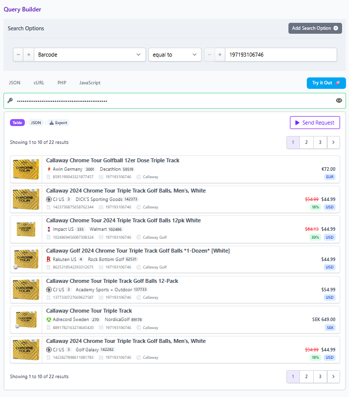 Explore the Query Builder and Product Search API to build and share your first barcode anchored comparison set. Use the identifier search, layer price and availability filters, and copy the share link to collaborate with your team.