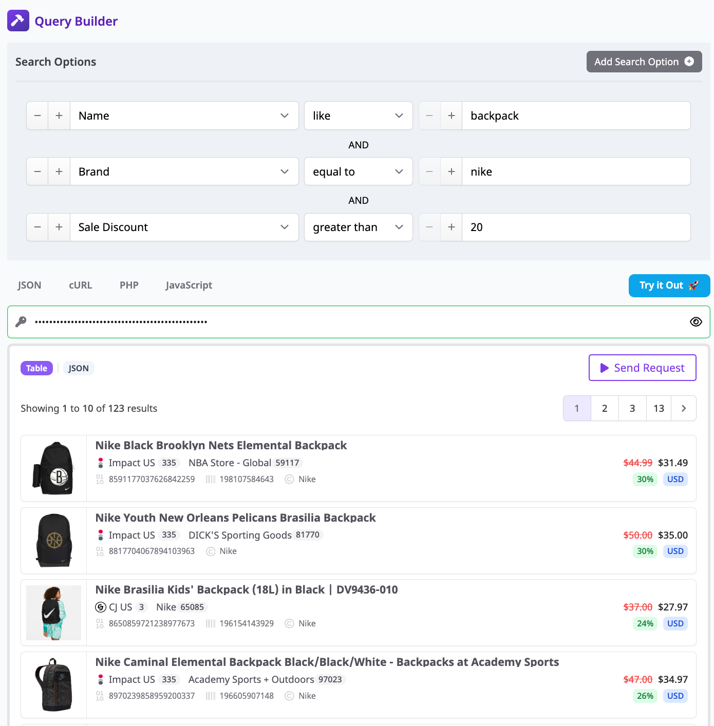 For example, run a query to find all Nike backpacks currently 20% off.