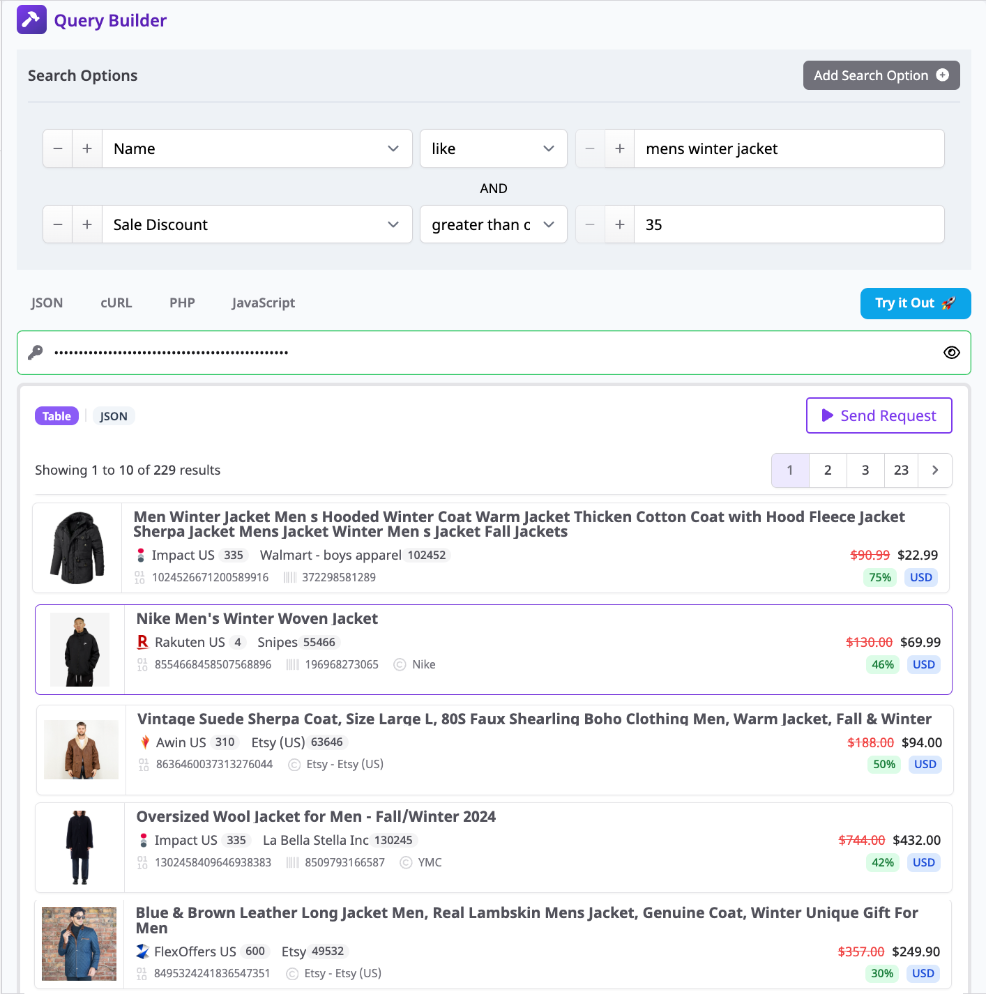 Or, run a query to discover which winter jackets have a sale discount greater or equal to 35%.