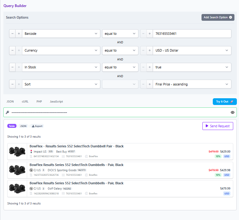 You can create this experience with the visual Query Builder or the Product API. In the Query Builder, choose barcode as your anchor, add currency and merchant filters, then sort by final price and discount. Copy the shareable link to reuse the exact same comparison set in content. For code based teams, the same filters map directly to request parameters and can be embedded in pages or internal tools.