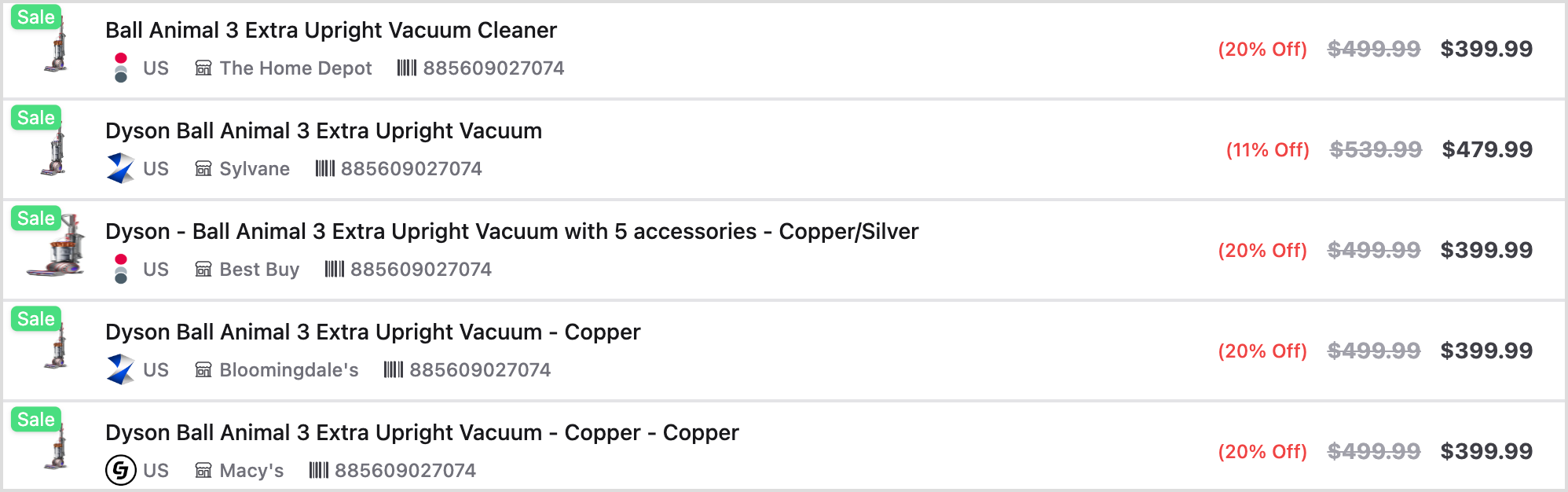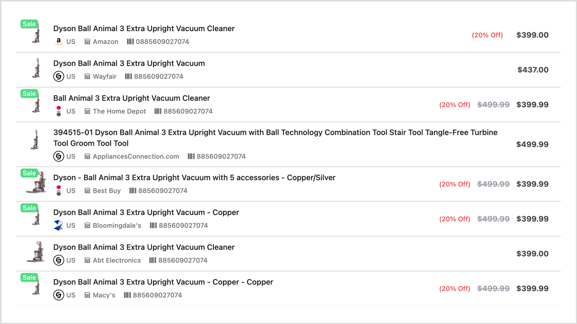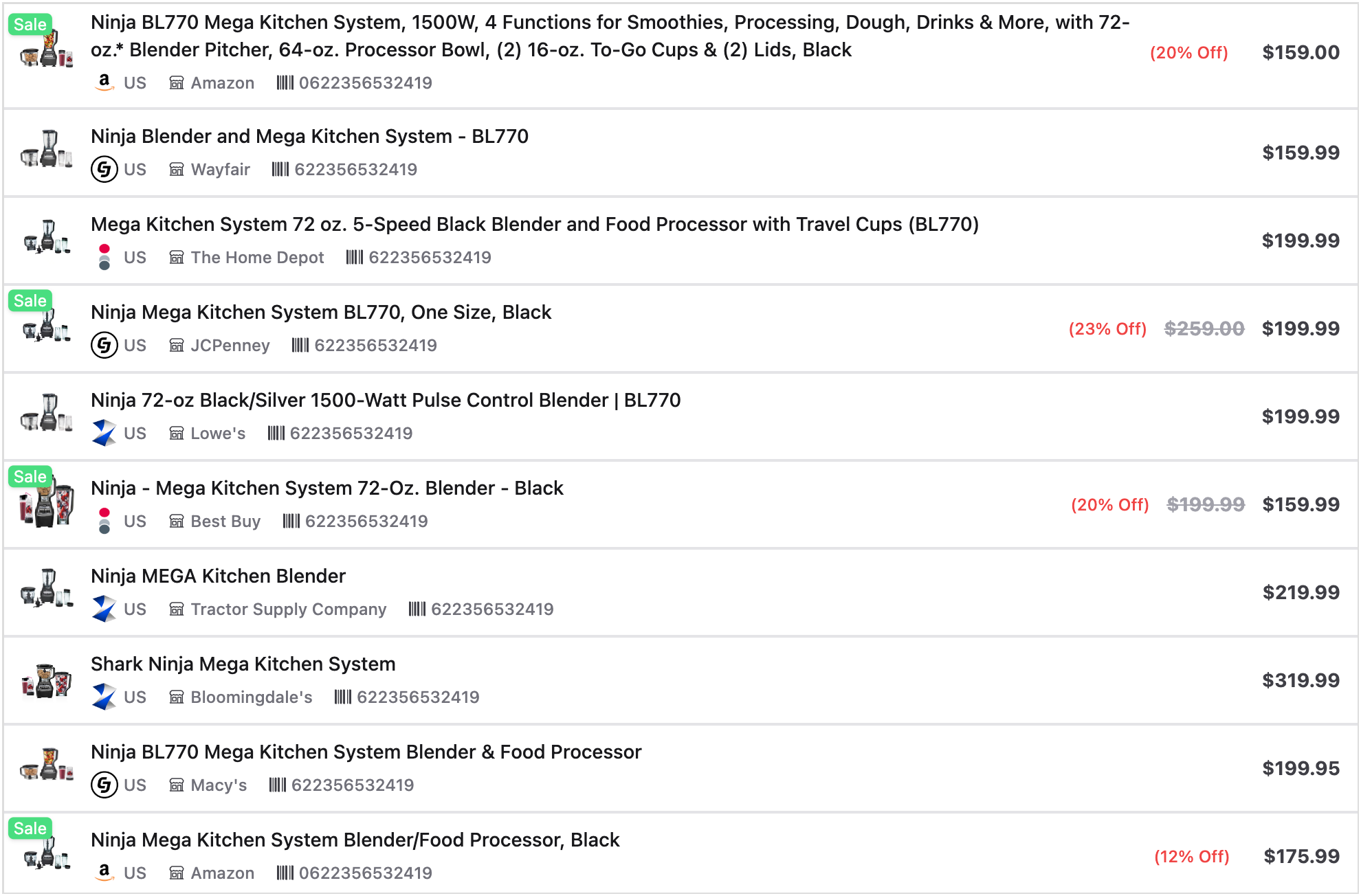 Barcode, sku, mpn, or asin ensure you compare the same item even when titles differ by merchant. Deduplication off returns all valid offers so you can render a full side by side.