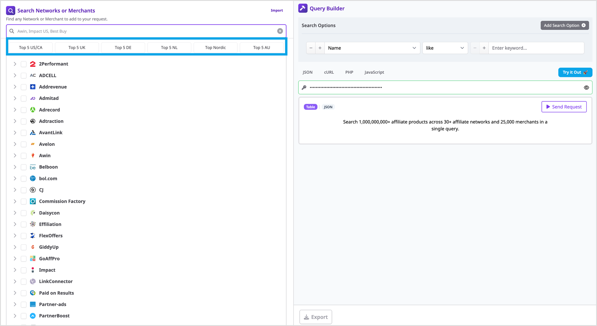 Search Top Networks in Your Region when you need quick coverage without sacrificing governance. In Affiliate.com, you can pre select the top networks for a market in one click, then query more than thirty networks and over a billion products using the same filters you rely on for identity, currency, and availability.
