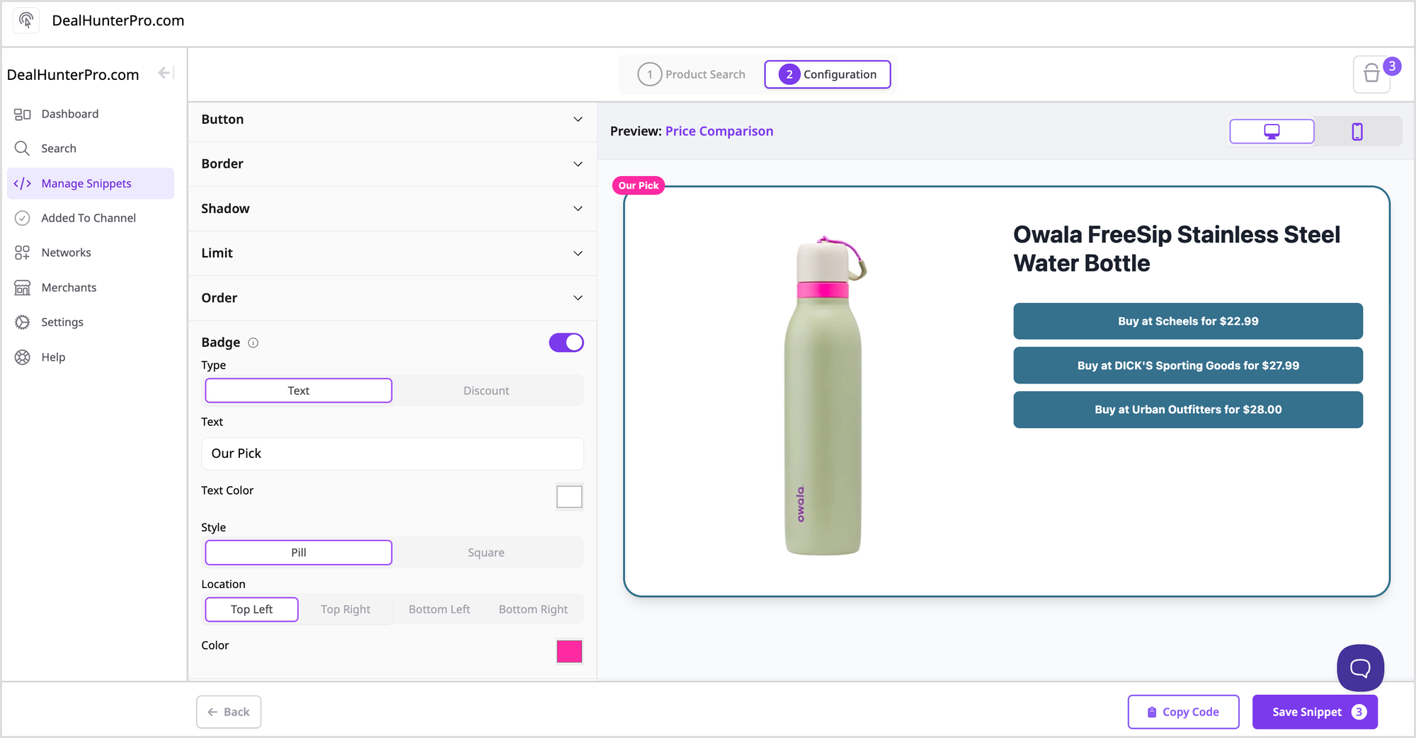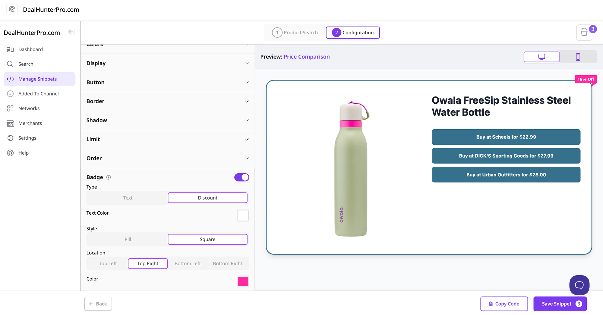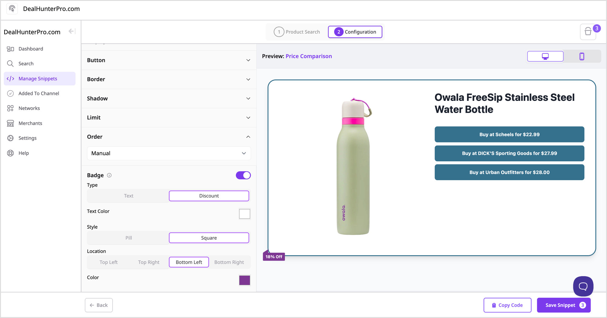 If the Snippet has a product that is on sale, the percentage off can automatically be displayed in the Badge.