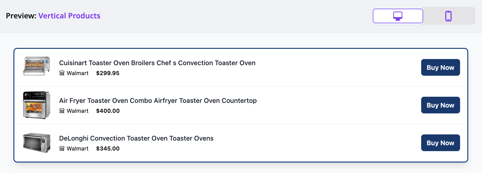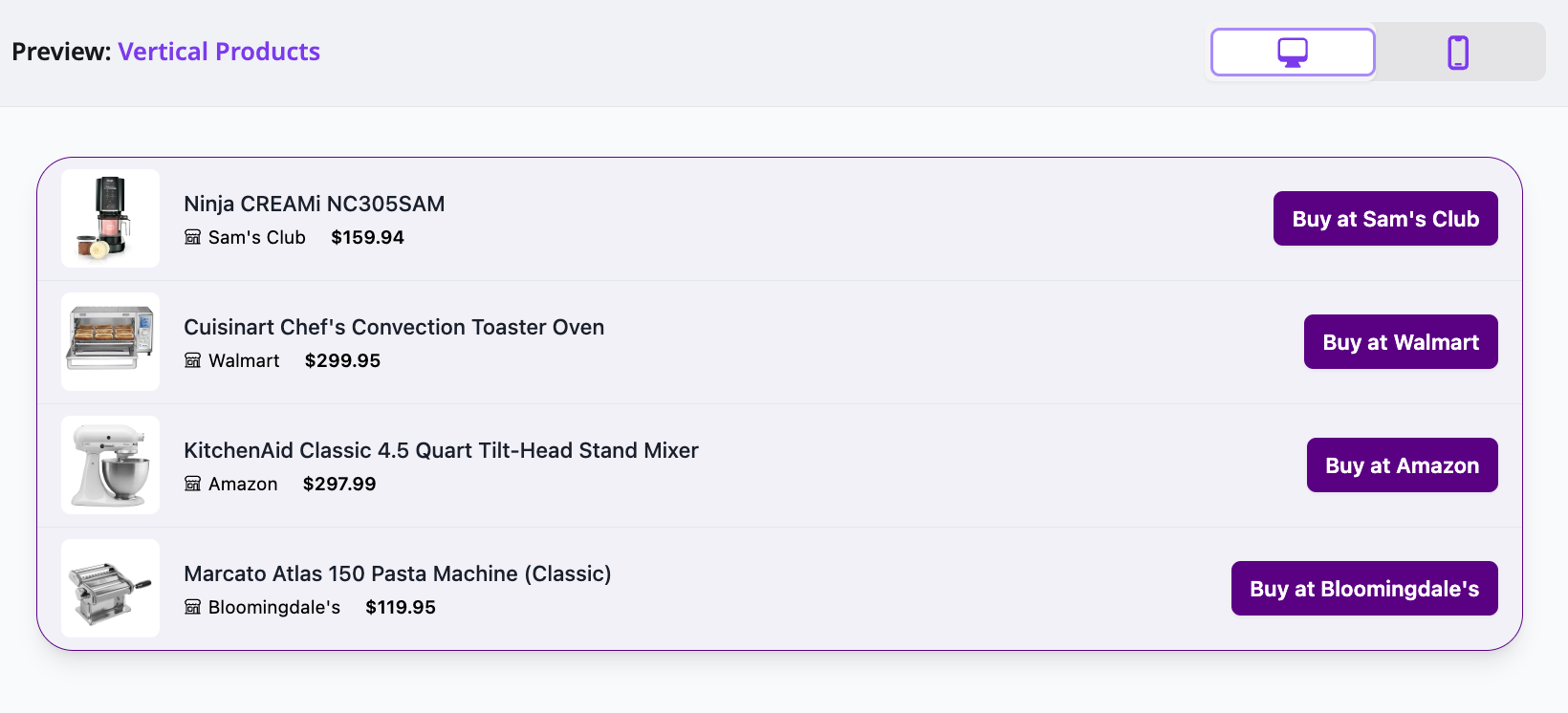 Shows a compact list of products from one or more merchants. Use it for category roundups or short lists.