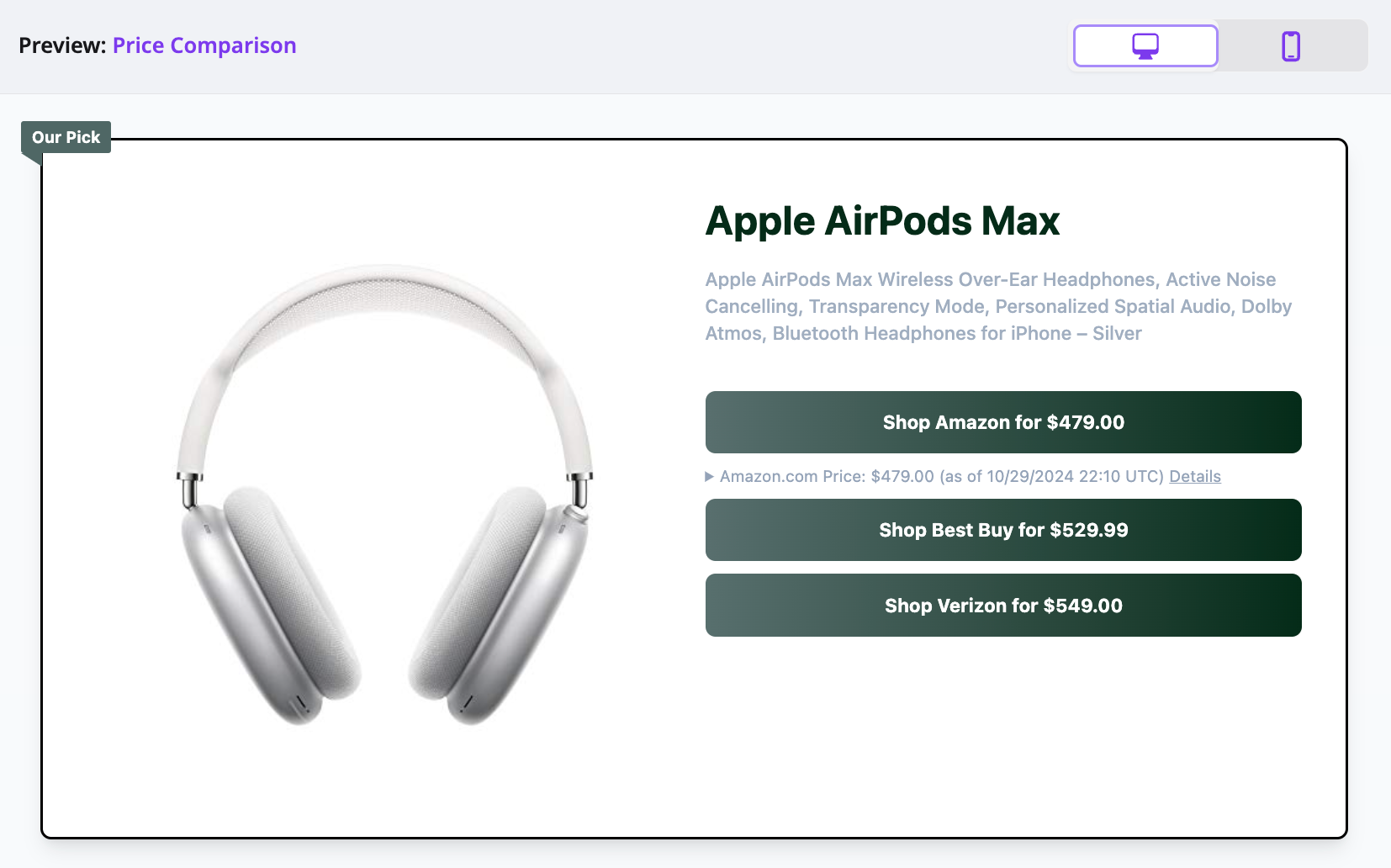Highlights one product from one merchant, ideal for editorial callouts or long form reviews. Use identifiers to lock to the exact SKU, then set deduplication on to avoid alternate offers.