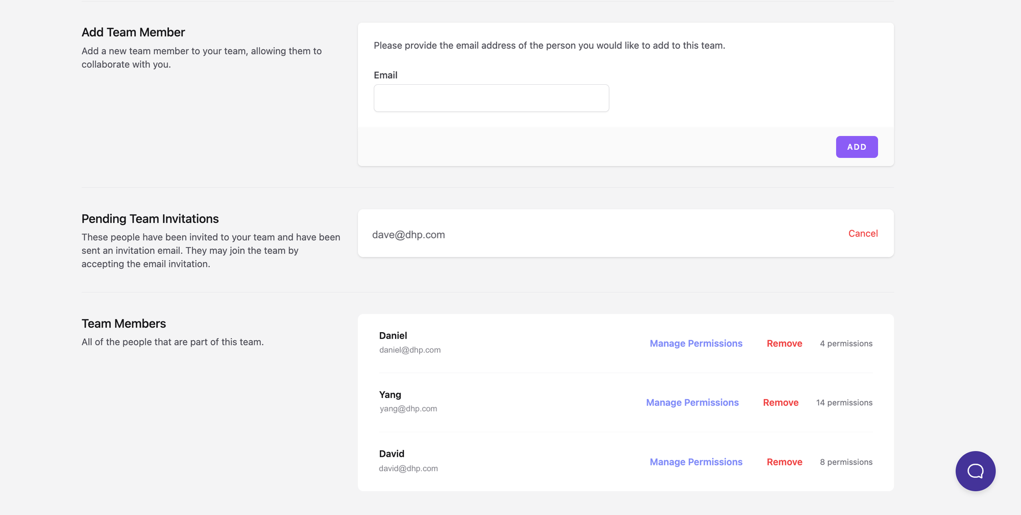 These permissions can be modified at any time. Only the Team Admin can see how many permissions each Team Member has.
