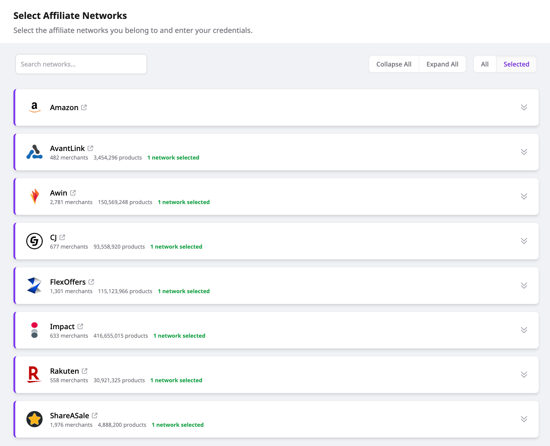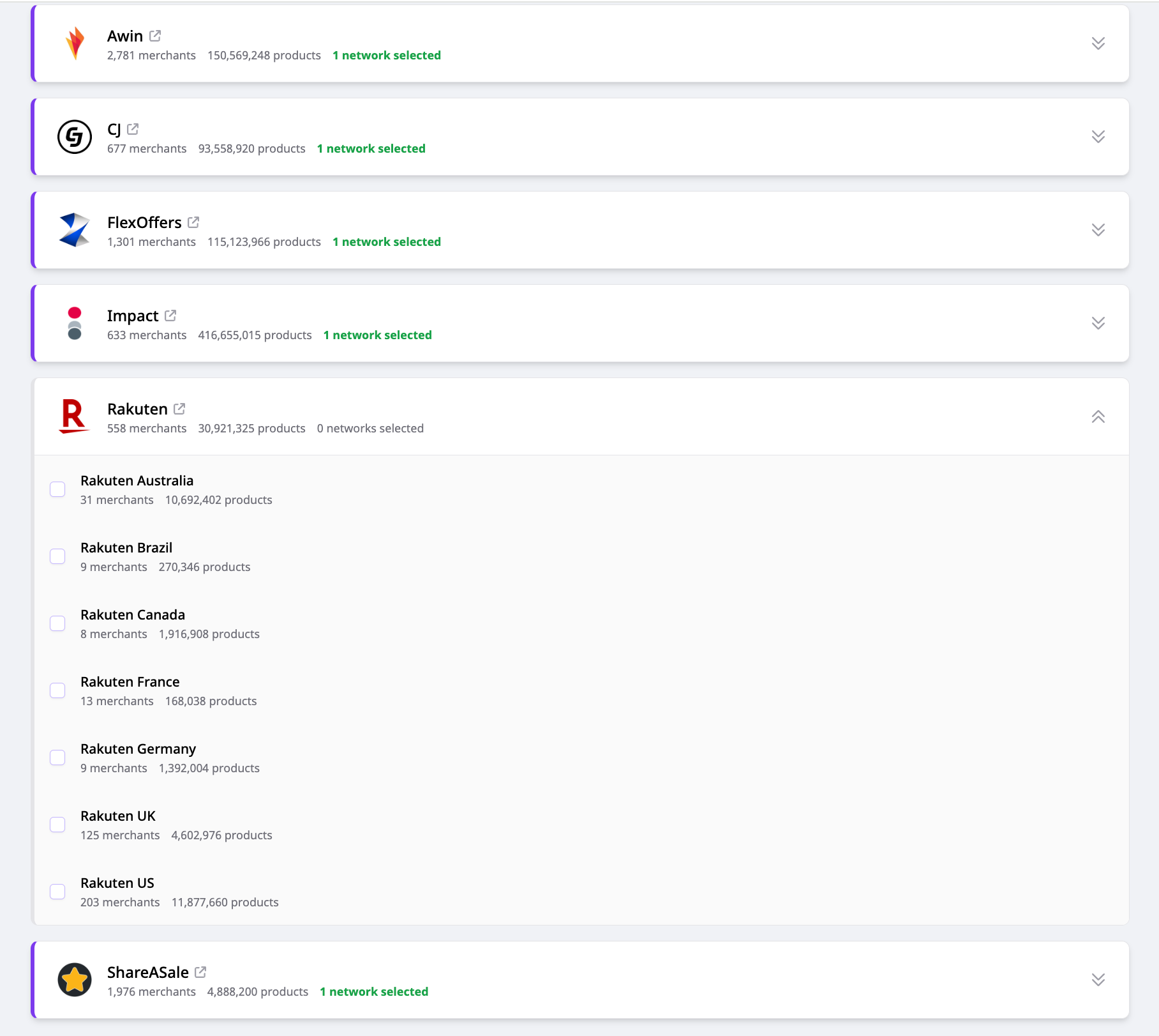Here, you can explore all the networks integrated on Affiliate.com, see the number of merchants supported within each network, and view the total product count across all the supported merchants.